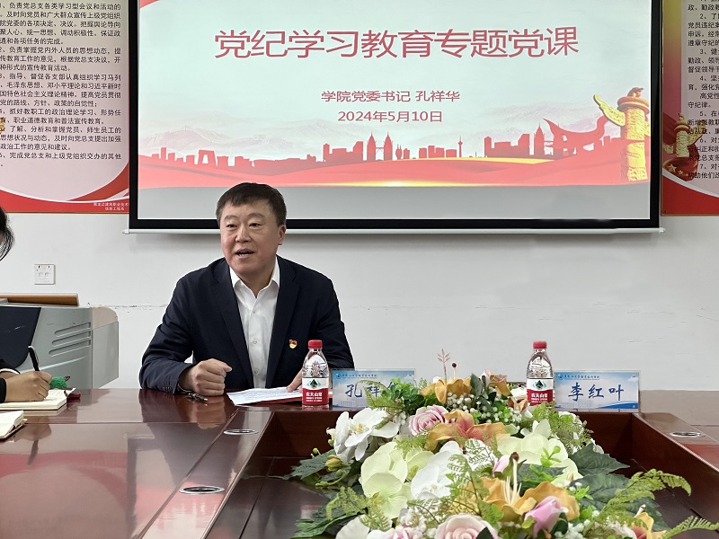 按照党纪学习教育工作安排,为进一步加深对最新修订的《中国共产党纪律处分条例》的理解和执行,2024年5月10日,在鲁班楼D502会议室,黑龙江建筑职业技术学院党委书记孔祥华为信息工程系的全体教师党员讲授党纪学习教育专题党课。