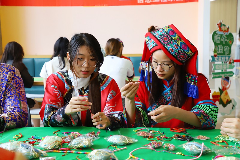 此外,活动还安排了五彩绳和香包的制作环节。同学们在老师们的指导下,亲手缝制彩绳和香包。现场展示的各民族传统服饰和手工艺品更是让大家大开眼界,领略到了中华民族文化的博大精深。